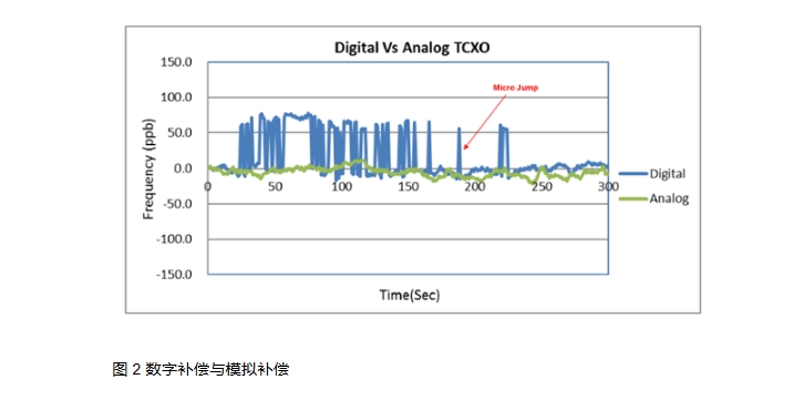 接下來,我們將看一個(gè)繪圖圖,該圖顯示了數(shù)字補(bǔ)償與模擬補(bǔ)償在溫度范圍內(nèi)的影響。這將直觀地顯示我們之前討論的數(shù)字補(bǔ)償中的頻率跳躍或微跳躍。視覺效果很好地描述了模擬補(bǔ)償在穩(wěn)定頻率和減輕微跳躍方面的積極影響。下面的藍(lán)色數(shù)字圖清楚地顯示了應(yīng)用數(shù)字校正時(shí)出現(xiàn)的顯著頻率跳躍。micro-jumps 足夠大,足以導(dǎo)致依賴于此 clock的敏感電子設(shè)備出現(xiàn)問題。綠色模擬圖顯示了更線性的補(bǔ)償,幾乎沒有微跳轉(zhuǎn)。