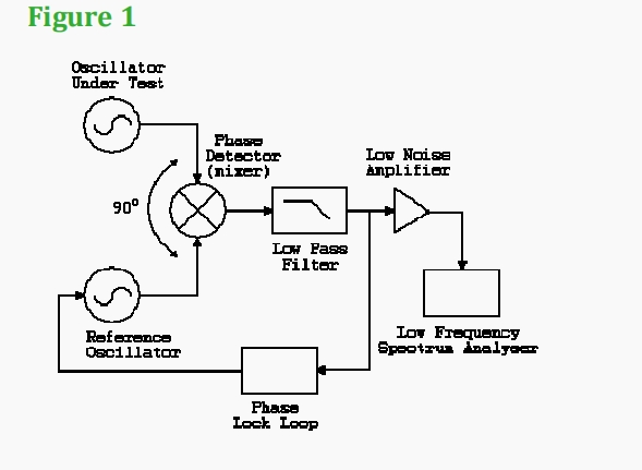 下一個考慮因素是用于進(jìn)行測量的測試設(shè)備。相位噪聲的測量是通過將被測振蕩器正交鎖定到參考振蕩器來實現(xiàn)的,如圖1所示。正交鎖定的效果是去除載波頻率,只留下非相位相關(guān)的噪聲分量。低通濾波器不是用來過濾相位噪聲的,而是用來去除2x頻率分量的。相位檢測器(混頻器)產(chǎn)生兩個輸入頻率的和(2x)和差(我們只對差感興趣,即沒有載波頻率的部分)。低噪聲放大器可以根據(jù)低頻頻譜分析儀的分辨率進(jìn)行切換。